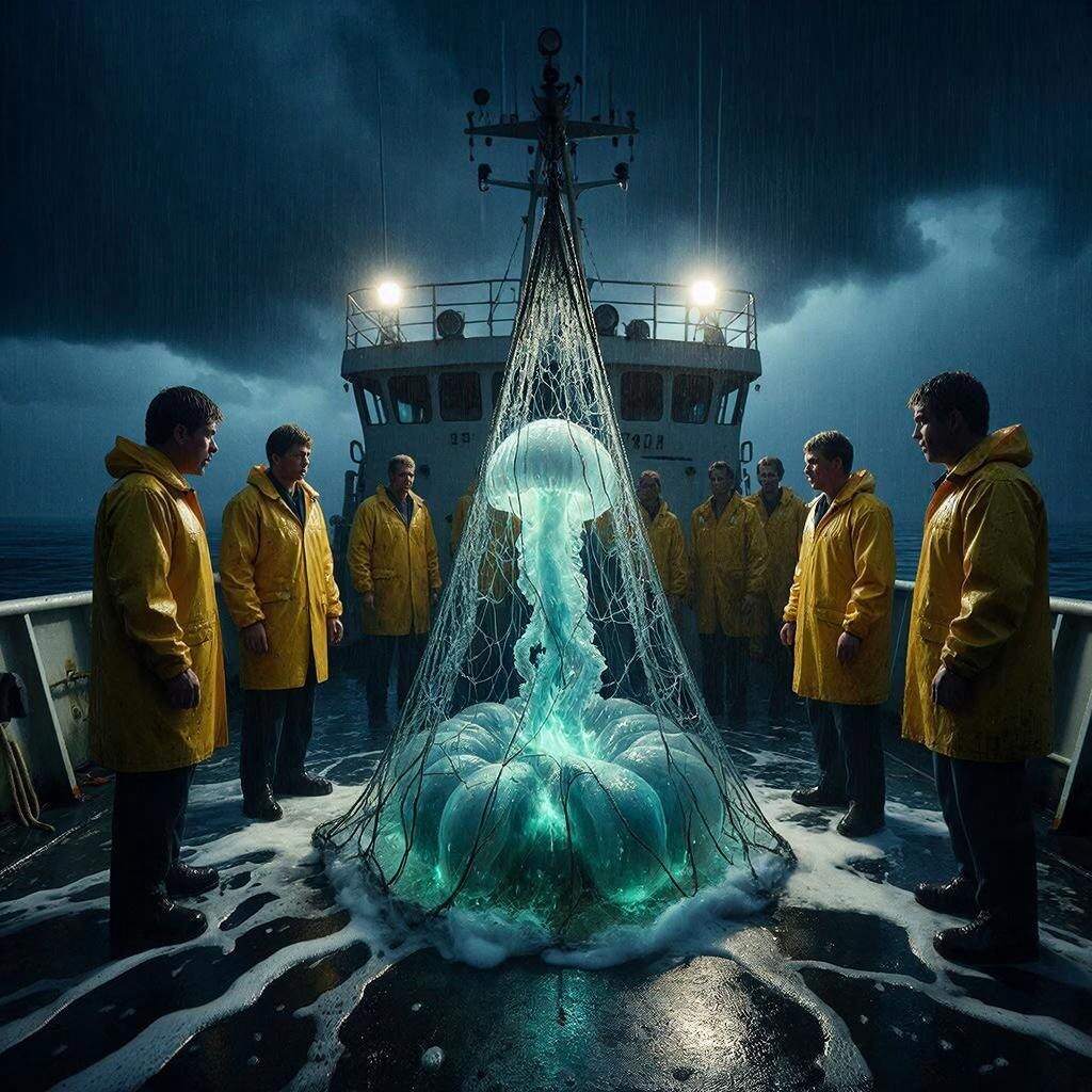 Не рыба в сетях. При выборке трала матросы заметили странное свечение среди серебристых тел рыбы. Когда сети развязали на палубе, все увидели полупрозрачное, студенистое тело, размером с крупную собаку. Оно медленно пульсировало голубоватым светом изнутри. Сквозь его оболочку просматривался гибкий стержень с узелками и сложная паутина светящихся прожилок. Существо не имело глаз, но на одном конце у него было воронкообразное углубление, окруженное концентрическими кольцами.