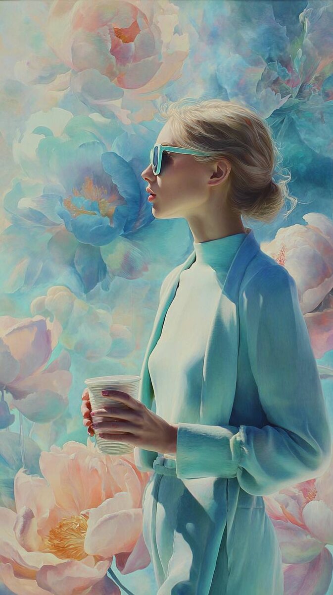 MidJourney ⤵️ Ultra-realistic portrait of a woman in profile walking through a dreamy, surreal landscape of large, softly glowing flowers. She is wearing a light turquoise outfit, matching sunglasses, and holding a cup of drink. Her skin is flawless, smooth with a porcelain-like texture, and her hair is styled in a soft, natural way. The background consists of oversized flowers in shades of blue, pink, and peach, with delicate, soft lighting creating a tranquil, ethereal atmosphere. The color contrast is high, with vivid yet balanced tones, focusing on the textures of her skin and the vibrant flowers. The scene is bright but serene, with soft, diffused light casting subtle shadows on her figure. The image is modern, fashion-forward, and dreamlike, with a high level of detail and clarity. --ar 9:16 --style raw" Делала в нейросетях➡️ тут Обучение работе с нейросетями ➡️ тут