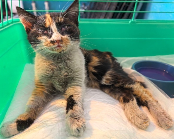 Тяжело дышит. Плохо ест. Калицивирус?...Ринотрахеит?.. Необходимо длительное лечение и полноценное питание. Рассказывает АРСЕНИЯ: "Тракторист вывозил с рынка мусор и подобрал возле ворот замерзающего больного котенка. Принес к женщинам в павильон. Там меня все знают и часто обращаются, поэтому обратились и в этот раз. Это кошечка, по возрасту ей примерно три с половиной или четыре месяца. Истощенная, обезвоженная, с поносом и заклеенными гноем глазами. Говорят был и второй котенок, рыженький. Но видимо, погиб от болезни и переохлаждения. Тракторист говорит мальчишки подобрали, но я сомневаюсь, потому что котенок с поносом вряд ли кому то сильно нужен... Посадила кошечку на грелку, поставила воду и корм. К еде она не притронулась, а вот пила очень долго, да так и осталась уткнувшись сидеть возле воды. Уколола ей теплый раствор рингера с в12, тилозин, дала метронидазол. Протерла глаза ватными дисками, смоченными хлоргексидином и заложила тетрациклиновую мазь. Первая помощь оказана. Тепер