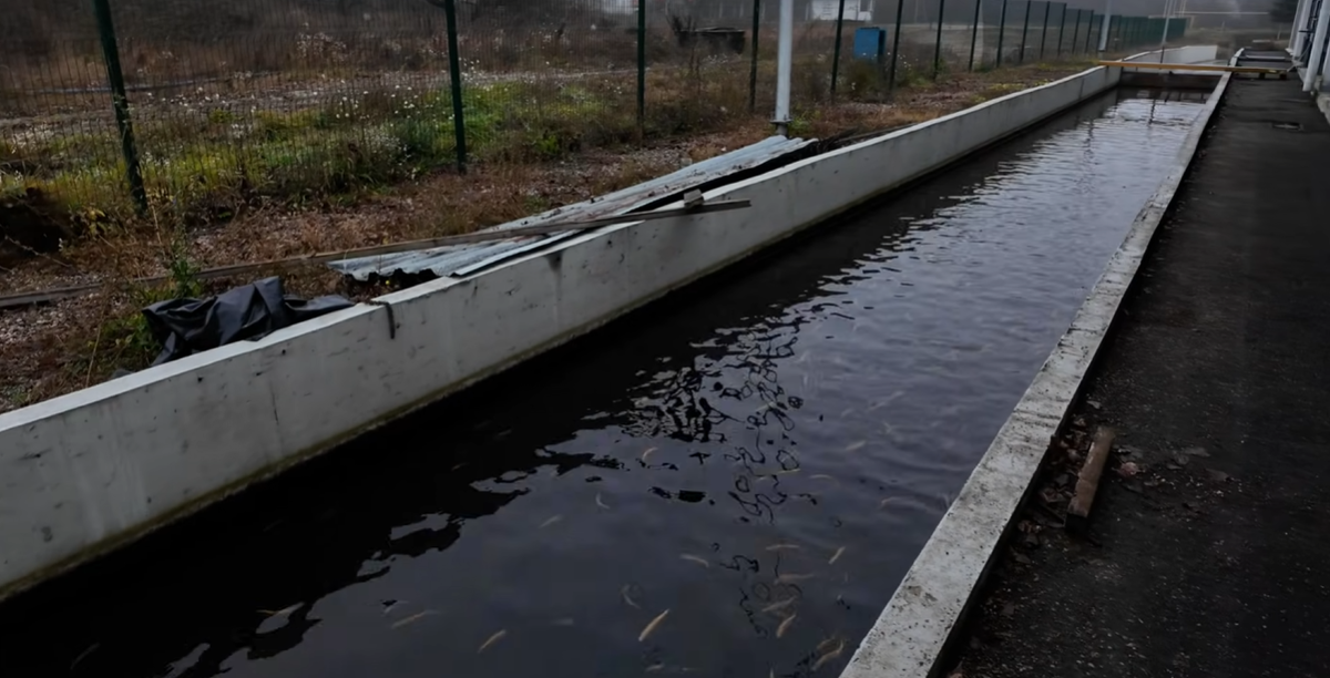 Вместо круглых пластиковых бассейнов здесь используют вытянутые бетонные каналы (прямоугольные, U-образные и т.п.). Рыба живёт именно в них.