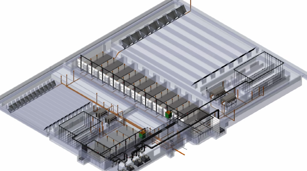Это один большой железобетонный резервуар (фактически единый бассейн), который внутри разделён бетонными перегородками на камеры. В этих камерах стоят и рыбоводные зоны, и очистка, и дегазация, и циркуляция, а вода вместо труб перетекает из камеры в камеру через переливы.