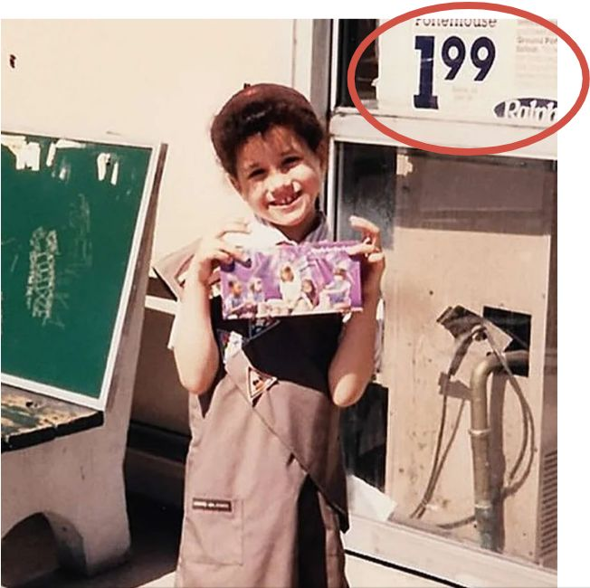 В апреле 2025 года Меган Маркл опубликовала детскую фотографию, на которой она одета в форму девочек-скаутов и держит коробку с печеньем. На заднем плане заметна рекламная вывеска супермаркета Ralph’s с ценой на стейк «Портерхаус» — 1.99 доллара за фунт.