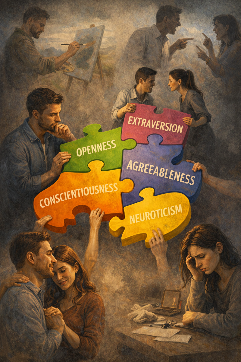 Почему одинаковые ситуации одни воспринимают как вызов, а другие — как угрозу? Современная психология личности даёт на это достаточно чёткий ответ. Одна из самых эмпирически подтверждённых моделей — Большая пятёрка черт личности (Big Five). Она не описывает «типы людей», но объясняет устойчивые различия в поведении, мышлении и эмоциональных реакциях. Модель Big Five возникла на основе лексического подхода: исследователи анализировали, какие личностные характеристики чаще всего используются в языке, и статистически выделяли устойчивые кластеры. В результате были выделены пять базовых факторов личности, каждый из которых представляет собой континуум — от низких до высоких значений. Отражает степень ориентированности на внешний мир. Связана с отношением к другим людям. Отражает саморегуляцию и ориентацию на цели. Показывает эмоциональную стабильность. Связана с когнитивной гибкость