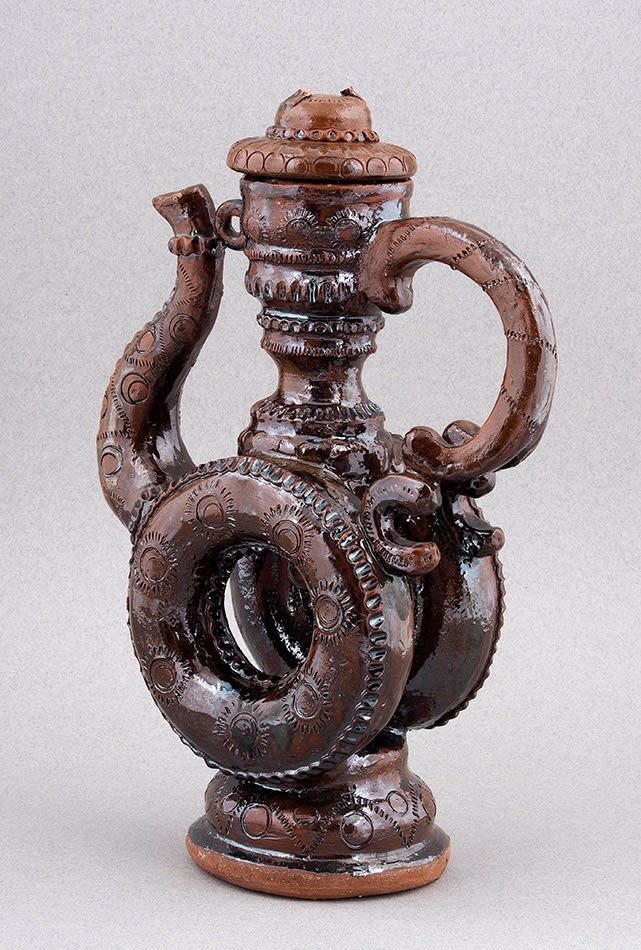 Самые древние из дошедших до нас сосудов сделали гжельские мастера. Один из них даже «помнит» точную дату рождения — 1771 год. Формы у этих квасников были смелые и сложные: в центре — диск, а иногда и сквозное отверстие, куда клали лёд, чтобы квас оставался прохладным. Продуманная система охлаждения задолго до появления холодильников — инженерия по-русски. К этому добавлялись изогнутые носики, расширяющееся горло, ручки и ножки в виде лап. Лепить такое могли только опытные гончары: малейшая ошибка — и вся конструкция теряла баланс. Неудивительно, что каждый сосуд был почти уникален.