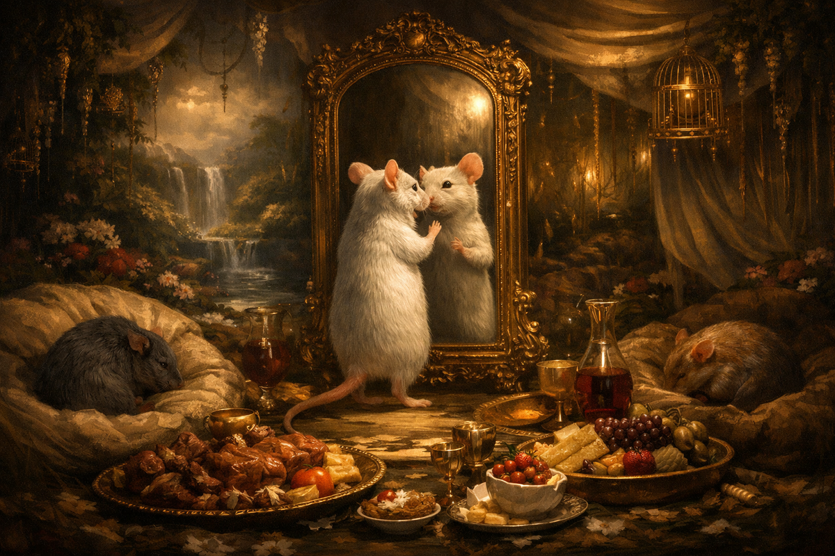 Меня не отпускает один образ. Упитанные мыши с блестящей шерстью. Физически здоровые. Сытые. В безопасности. И при этом — мертвые внутри задолго до остановки сердца. Рай, в котором некем быть. Изобилие, в котором нечего делать. Безопасность, в которой нечего защищать.