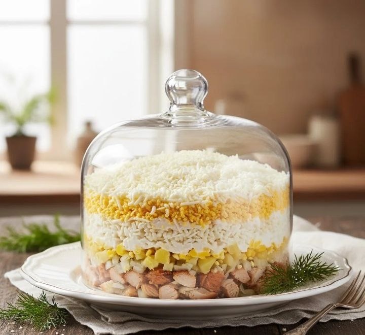 🥗 ⏱ 20 минут | 175 ккал(100 г) 🛒 Что нужно: 🍗 Копченая куриная грудка — 200 г 🥚 Яйца вареные — 3 шт. 🥔 Картофель вареный — 2 шт. 🧀 Сыр плавленый (подмороженный) — 2 шт. 🧅 Лук репчатый — 1 шт. 🥣 Майонез — 3 ст.л. 🍎 Уксус — 1 ст.л. (для маринада лука) 🧂 Соль, перец — по вкусу 👩🍳 Как готовить: Лук нарежьте мелкими кубиками и замаринуйте в смеси уксуса и воды (1:1) на 10 минут, затем слейте жидкость. Курицу нарежьте мелкими кусочками. Картофель, белки и желтки яиц, а также плавленые сырки натрите на мелкой терке в разные миски. Выкладывайте слоями, промазывая каждый тонкой сеточкой майонеза: курица, маринованный лук, картофель, желтки, плавленый сыр и финальный слой — тертые белки (они создают эффект пышности). Дайте салату пропитаться в холодильнике хотя бы час. Вкусные Рецепты 😋