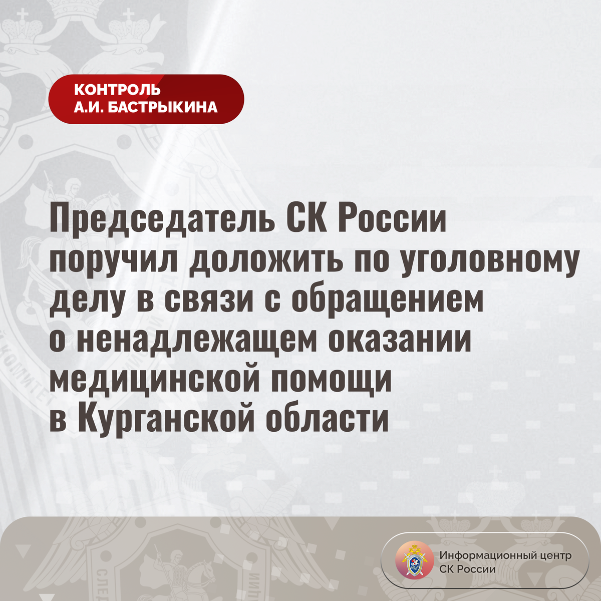 Председатель СК России поручил доложить по уголовному делу в связи с обращением о ненадлежащем оказании медицинской помощи в Курганской области В комментариях в аккаунте приёмной Председателя СК России А.И. Бастрыкина «ВКонтакте» размещено обращение жительницы Курганской области по вопросу несогласия с ходом установления обстоятельств некачественного оказания ей медицинской помощи в одном из медицинских учреждений. В январе 2022 года женщину в плановом порядке госпитализировали. Однако вследствие неверно выбранной тактики оказания медицинской помощи при родоразрешении дети родились в тяжелом состоянии, при этом один из младенцев скончался спустя непродолжительное время в реанимационном отделении. До настоящего времени никто к ответственности не привлечен. В СУ СК России по Курганской области расследуется уголовное дело, по которому ранее А.И. Бастрыкин поручал представить доклад. Председатель Следственного комитета Российской Федерации Александр Иванович Бастрыкин поручил руководителю