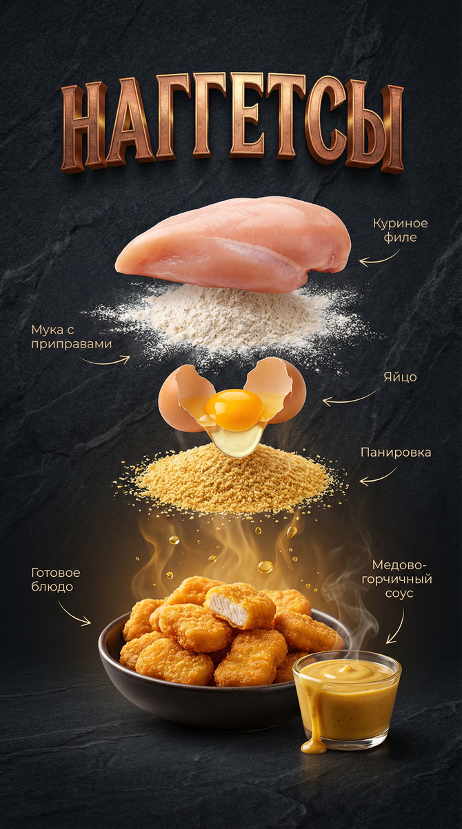 Помните, как в детстве вы мечтали, что наггетсы — это маленькие золотые самолётики вкуса? Так вот, взрослая версия этой мечты — прямо здесь. Только теперь вы сами решаете, что попадёт в панировку, а что — в соус. И да, никаких «ароматизаторов дыма» и загадочных E-добавок.