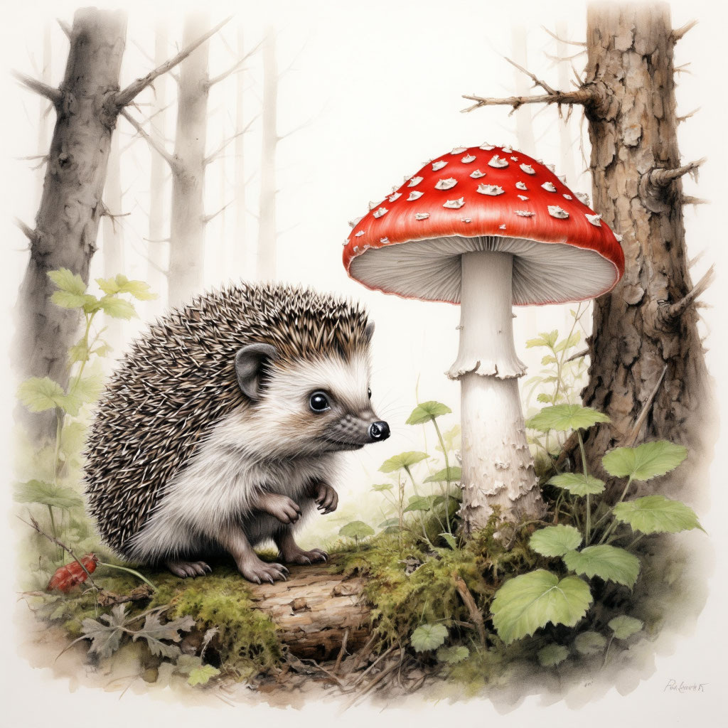 Ёжик Колючка гулял по лесу и нашёл большой красивый гриб с пятнышками.