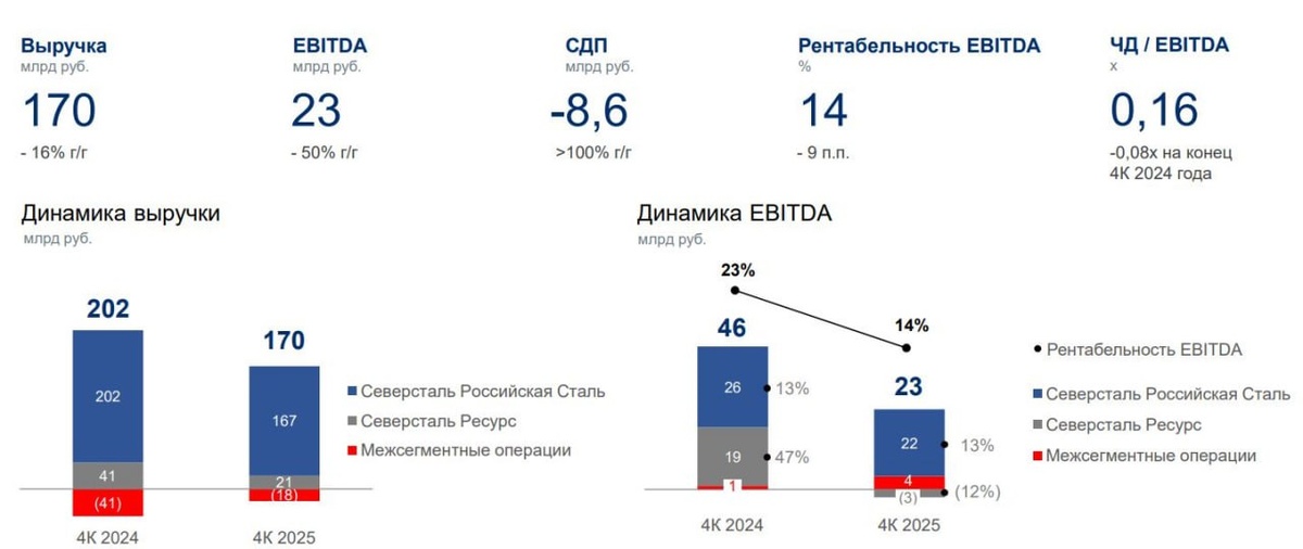 Отчётность Северстали за IV квартал 2025 года не стала сюрпризом для рынка. Падение выручки на 16% г/г, двукратное сокращение EBITDA и чистый убыток в размере 17,7 млрд руб. выглядят болезненно на бумаге, но в реальности укладываются в общую картину отрасли. Ключевой фактор — слабый спрос. Высокая ключевая ставка продолжает охлаждать российскую экономику, а потребление стали в стране в 2025 году снизилось примерно на 14%. Давление усиливается и со стороны Китая: экспорт стали из КНР обновил исторический максимум, что продолжает «прижимать» мировые цены. На операционном уровне Северсталь выглядит устойчиво. ✅Производство стали и чугуна выросло; ✅Загрузка мощностей сохранена; ✅продажи металлопродукции по итогам года даже увеличились; ❗️Однако структура продаж ухудшилась: доля продукции с высокой добавленной стоимостью снизилась, а это напрямую бьёт по марже. EBITDA-рентабельность в IV квартале опустилась до 14% — минимальные уровни за многие годы 💲 Отдельно стоит сказать про убыток. Он