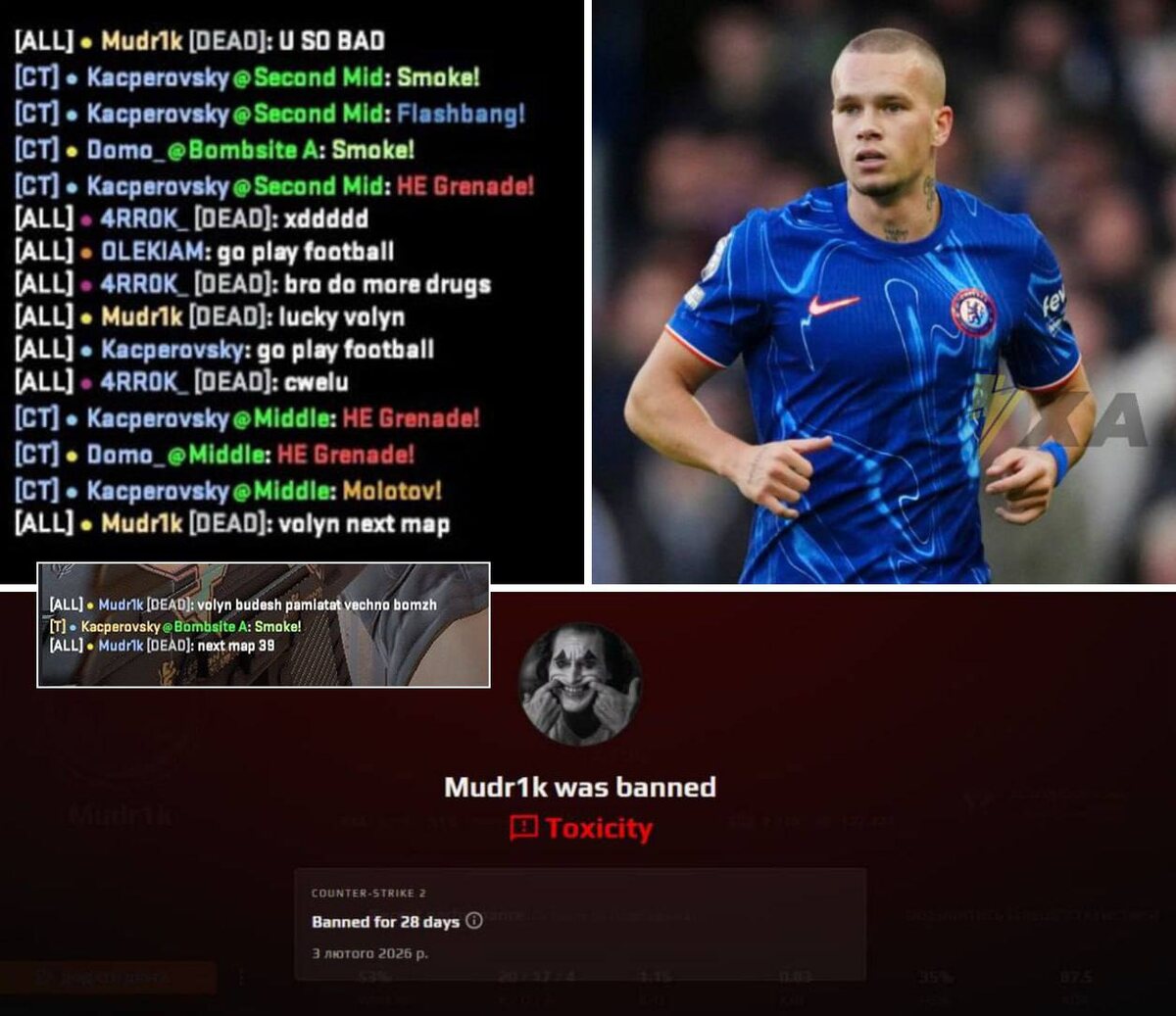 Во время игры в CS2 игрок «Челси» Михаил Мудрик поссорился с соперником из Польши. Украинский футболист назвал его «бомжом» и напомнил о Волынской резне, устроенной боевиками УПА* в 1943 году. «Волынь будешь помнить вечно, бомж», — написал Мудрик. В итоге спортсмена дисквалифицировали на 28 дней. Видимо, для Мудрика убийство сотни тысяч мирных людей – повод для гордости. * Организация признана в России экстремистской и запрещена. Сайт "Другая Украина" / Telegram / Вконтакте / Центр поддержки Украинцев / Жалоба на ТЦК "Другая Украина" теперь в МАХ