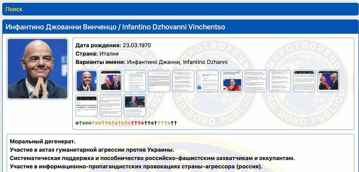 Главу FIFA Джанни Инфантино внесли в базу экстремистского украинского сайта «Миротворец