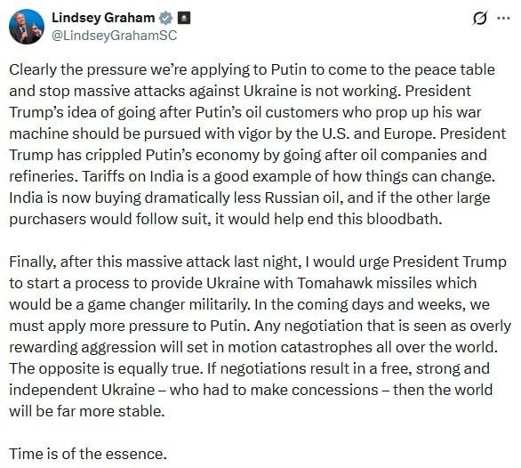 Сенатор, террорист и экстремист, Линдси Грэм призвал Трампа передать Украине «Томагавки». Поскольку, его мнению, текущее давление на Россию, по его мнению, не работает. «Очевидно, что давление, которое мы оказываем на Путина, чтобы он сел за стол переговоров и прекратил массированные атаки Украины, не работает. Идея президента Трампа о преследовании нефтяных клиентов Путина, поддерживающих его военную машину, должна быть энергично реализована США и Европой. Наконец, после этой массированной атаки прошлой ночью, я бы призвал президента Трампа начать процесс поставки ракет «Томагавк» Украине, что стало бы переломным моментом в военном отношении. В ближайшие дни и недели мы должны усилить давление на Путина. Любые переговоры, которые будут восприниматься как чрезмерное поощрение агрессии, приведут к катастрофам по всему миру», - написал Грэм. Скажу коротко: передача Томагавка — это прыжок в деле ядерной эскалации. Томагавк может быть в ядерном исполнении, что летит в нашу сторону – мы