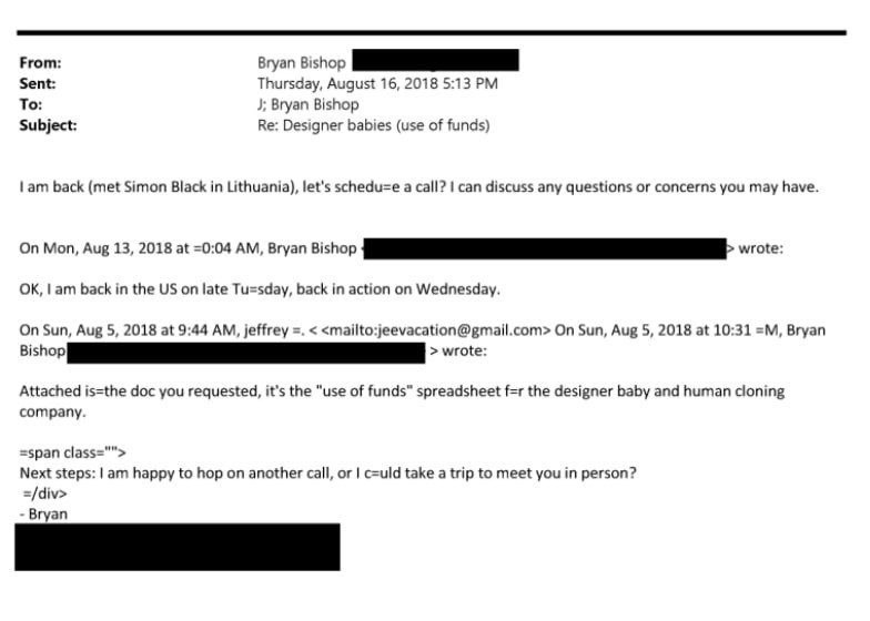 Радиоведущий Брайан Бишоп отправил Джеффри Эпштейну электронное письмо в августе 2018 года с таблицей "использования средств" для "компании по созданию дизайнерских детей и клонированию людей".