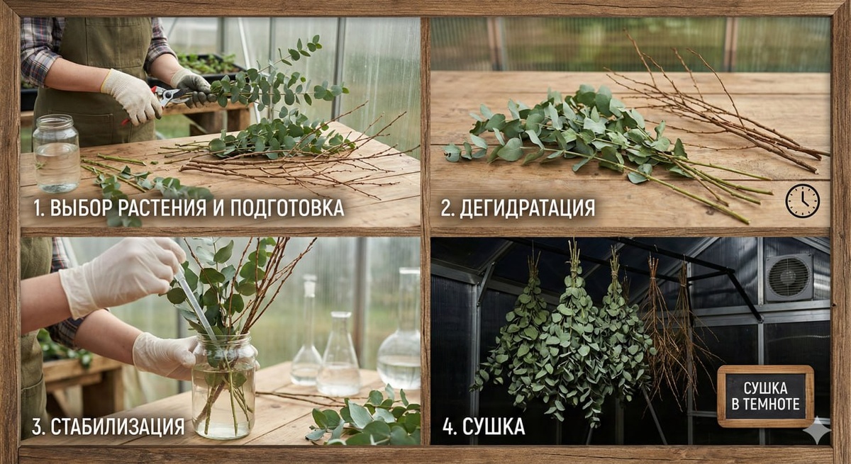 Вот основные этапы: 1.Подготовка. Возьмите подходящее растение.Удалите лишние листья. 2.Дегидратация.Оставьте без воды (расскажем, для каких растений этот этап не нужен) 3.Стабилизация. Срежьте под углом, открыв сосуды.Поместите в питательный раствор — цветок впитает его по капиллярам. Вода уходит, её заменяет питательный раствор, делая растение живым на ощупь и сохраняя ему гибкость. 4.Сушка. Высушите в тёмном месте. Результат: ваш букет простоит месяцы Технология простая, результат впечатляющий!