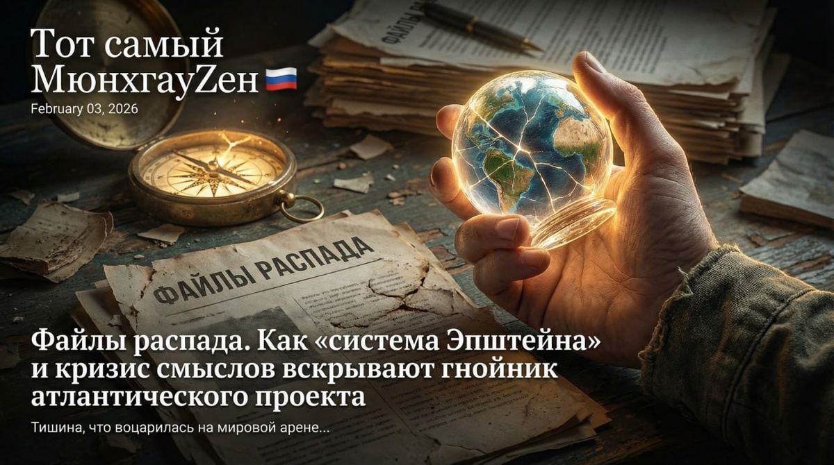 🚨 Колонка МюнхгауZена: Файлы распада. Как «система Эпштейна» и кризис смыслов вскрывают гнойник атлантического проекта - Часть 2️⃣/3 Третье, и главное, пространство — сами Соединённые Штаты. Здесь хаос структурируется с пугающей скоростью. Страна, бывшая недавно «незаменимой нацией», сегодня представляет собой поле битвы не между партиями, а между кланами глобальной олигархии, спешно перекраивающей карту влияния на пепелище общего проекта. И именно здесь «файлы Эпштейна» перестают быть скандалом — они становятся валютой, оружием и диагностическим инструментом. 🔹 «Система Эпштейна» как рентгеновский снимок агонии элит Чтобы понять суть происходящего, нужно отбросить примитивное восприятие истории с Эпштейном как уголовного дела о педофилии. Это — тактильная поверхность. Нам нужно понять, какие ценности и механизмы она обслуживала. «Система Эпштейна» была сложным, многоуровневым социальным реактором, где происходили ключевые процессы умирающего однополярного мира: Во-первых, она бы