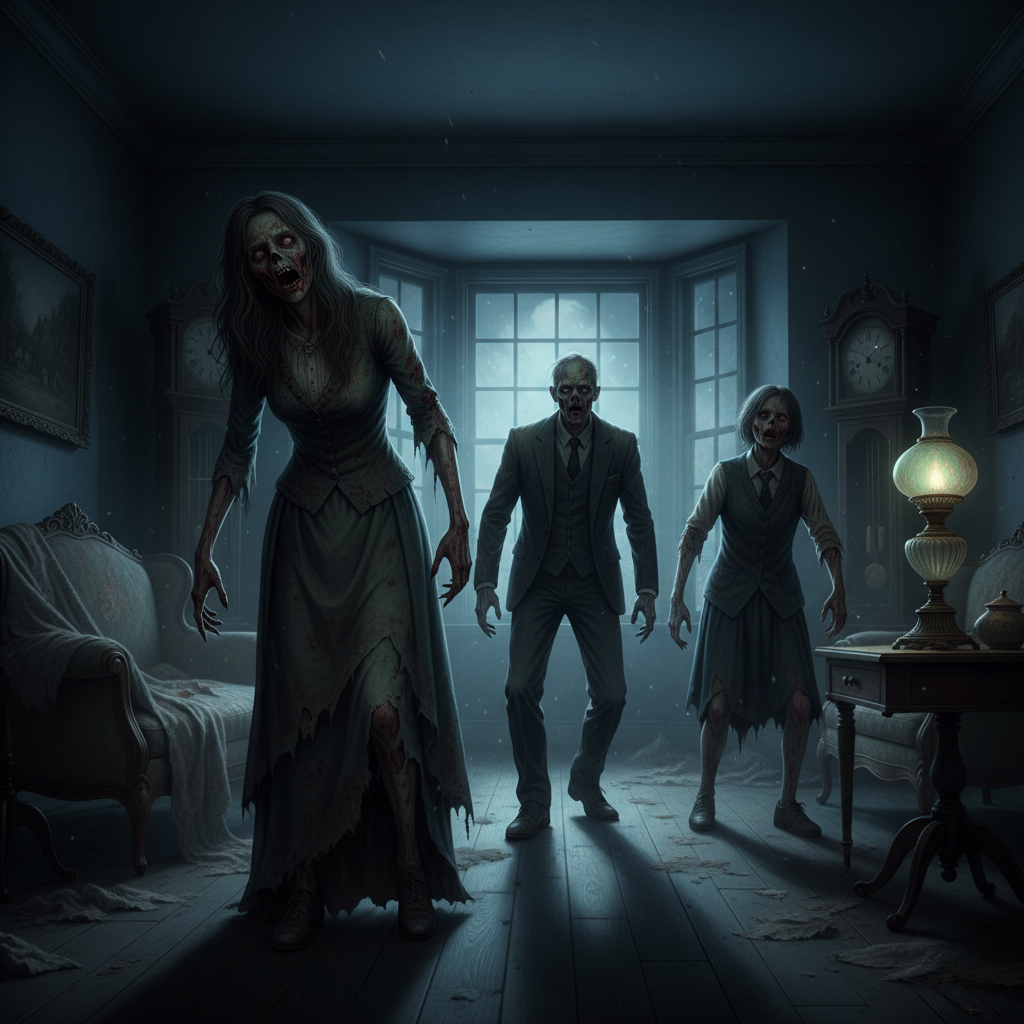 Между тем мертвецы повернулись и так же медленно, шаркая и волоча ноги, поплыли обратно в темноту гостиной, оставляя за собой следы черной слизи и ужаса. Дверь на веранду скрипнула и захлопнулась.