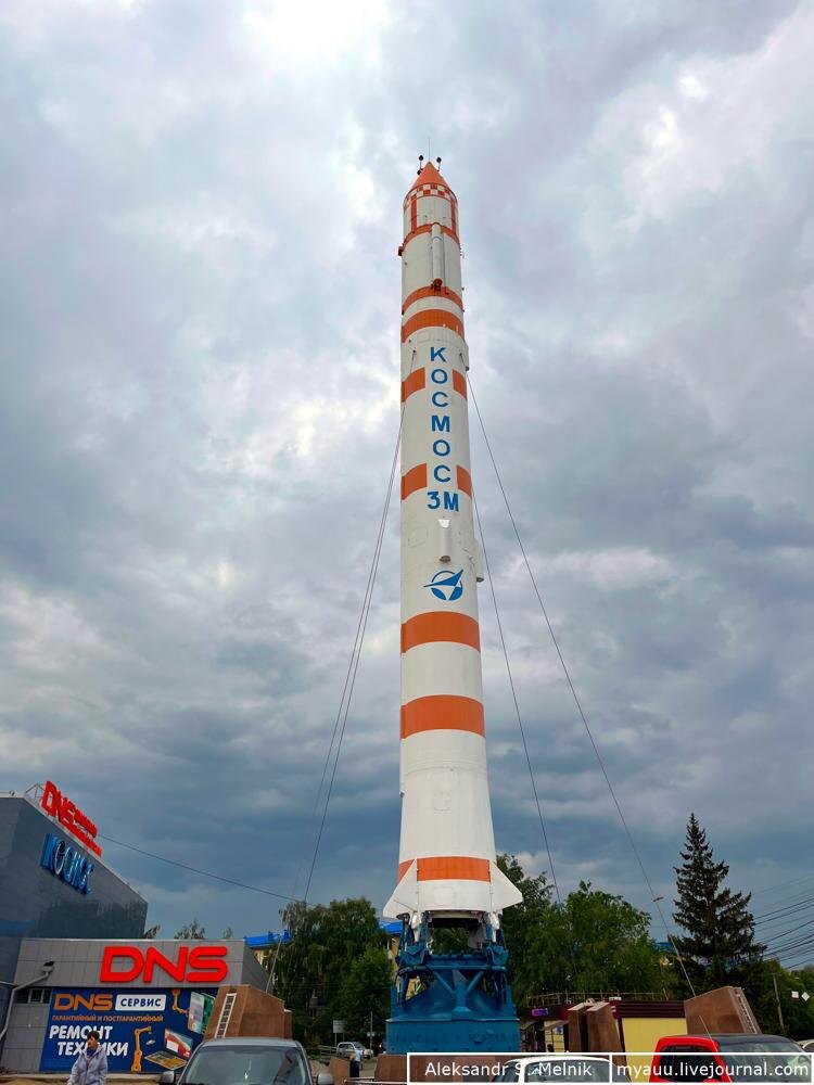 Дата съёмки: 29 июня 2023 года. Памятник установили в 2011 году к 70-летию Производственного Объединения "Полёт" (другие таблички листаем). Двухступенчатая одноразовая ракета-носитель лёгкого класса "Космос-3М" (11К65М) стала развитием ракет "Космос-1" и "Космос-3", гражданских версий баллистической ракеты Р-14 (8К65). Первый запуск был выполнен: 15 мая 1967 года. Последний запуск: 27 апреля 2010 года. За всё время было выполнено 397 успешных пусков, 9 частично успешных и 18 аварийных. Запуски проводились с площадок полигона Капустин Яр и космодрома Плесецк. Стартовая масса ракеты немногим более ста тонн, выводимая на низкую орбиту полезная нагрузка около полутора тонн (для высоких орбит - половина тонны). "Космос-3М" применялся для вывода на орбиту навигационных, исследовательских и связных спутников, как советского/российского, так и иностранного пр