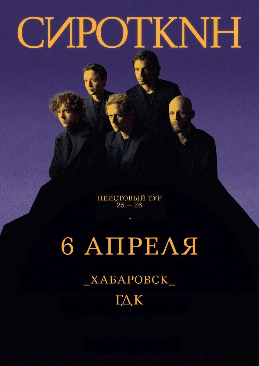 Неистовый тур ✔ Концерт инди-группы «Сироткин» в рамках нового тура ✔ Прозвучат известные хиты и новые треки, ещё не звучавшие со сцены ✔ Живое звучание и концертная энергия, ради которой приходят на выступления группы ✔ Возможность стать частью важного этапа в истории коллектива 📅 Когда: #6_апреля 19:00 ⛳ Где: Городской дворец культуры, ул. Ленина, 85 💳 Стоимость: 2500-7000 руб 📞 Контакты: +7 (4212) 46-44-17 Билеты 👉 Афиша Хабаровска. Куда сходить, экскурсии