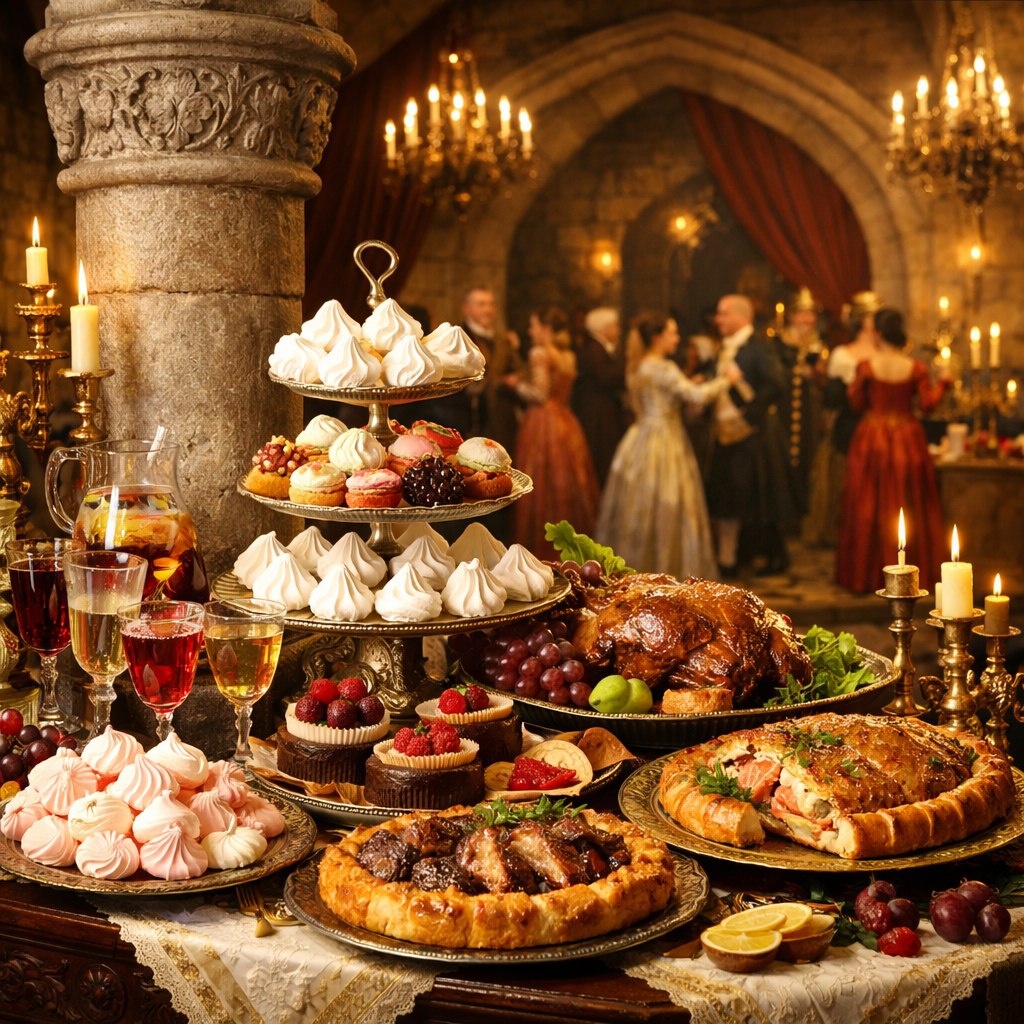 Столы ломились. На серебряных блюдах горками лежали фрукты - яблоки, груши. Рядом дымились пироги с дичью и рыбой. Но её взгляд приковали сладости. Целые башни из воздушных безе, напоминавшие замковые башенки. Миндальные печенья в форме ракушек. И главное – пирожные. Маленькие, изысканные, покрытые глазурью всех цветов радуги: розовой, шоколадной, бледно-зелёной.