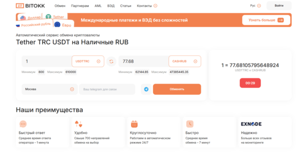 BitOkk ориентирован на клиентов, для которых приватность стоит на первом месте. Этот обменник криптовалют Сити работает в закрытом формате и подходит для обмена крипты на наличные без избыточных формальностей.
