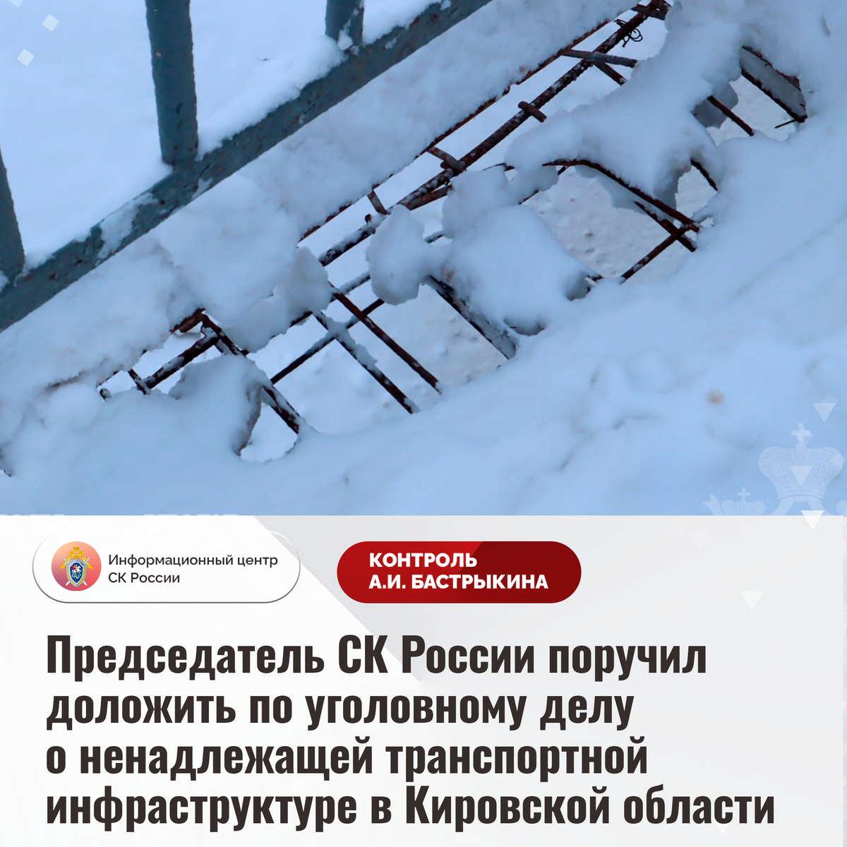 Председатель СК России поручил доложить по уголовному делу о ненадлежащей транспортной инфраструктуре в Кировской области В СМИ и социальной сети сообщается о нарушении прав жителей села Бахты Кировской области на качественную транспортную инфраструктуру. Пешеходный мост через реку Чахловицу, соединяющий части населенного пункта и расположенный на обочине проезжей части, длительное время находится в непригодном состоянии: конструкции разрушаются, ограждение частично отсутствует, уборка снега своевременно не проводится. Ранее пожилая женщина упала в обрыв, поскользнувшись при передвижении по переправе. Несмотря на имеющиеся нарушения, проведение капитального ремонта запланировано не ранее 2027-2028 гг. В СУ СК России по Кировской области возбуждено уголовное дело. Председатель Следственного комитета Российской Федерации Александр Иванович Бастрыкин поручил и.о. руководителя СУ СК России по Кировской области Султану Шагировичу Оразаеву доложить о ходе и результатах расследования уголовно