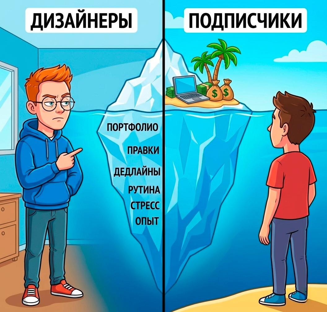 Одна из самых частых иллюзий в дизайне (в любом его направлении) в том, что можно взять, залететь в сферу и через недельку-две уже зарабатывать сеточку-другую Не, такие кейсы случаются, я подобное видел не раз, но это почти всегда удача и рандом И вот смотришь вроде на результаты других и думаешь «не ну а че, они могут, вон как классно выходит, щас тоже по быстрому научусь» Это «по быстрому» и есть самая большая ошибка в подходе к становлению классным дизом: 〰️ Вы видите верхушку айсберга Можно много показывать, кто и сколько заработал (кто-то даже придумывает такие кейсы), но мало показывают, что за этим стояло А там часто людям пришлось неплохо так попахать ради таких результатов И к этому нужно быть готовым 〰️ Дизайн важно и нужно полюбить Если ты плюешься от каждого действия, которое совершаешь, то привет выгорание через месяцок и заброшенное дело В нашей работе куча рутины, которую или делегируешь или принимаешь, как часть жизни 〰️ В нашей сфере уважают опыт и портфолио