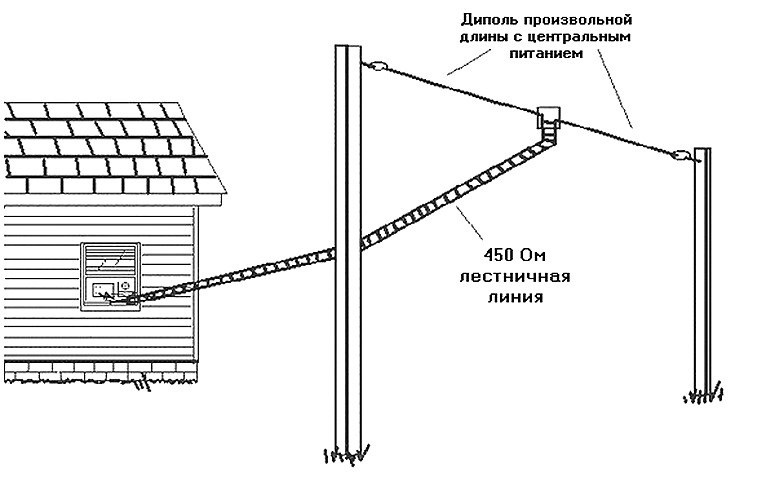 🔹 Отрезок провода случайной длины, разрезанный на две части, может служить диполем и эффективно излучать. Его длина должна быть не менее полуволны на самом низком диапазоне, в котором планируем работать. Он выглядит также, как вседиапазонный, за исключением того, что он не резонирует ни на одном диапазоне. 🔹 Диполь случайной длины описывается здесь, чтобы подчеркнуть, что излучающая часть антенны не обязательно должна быть резонансной. Поскольку его импеданс в точке питания будет необычным, его необходимо подключать через симметричную линию, тюнер и балун. Читать далее >>