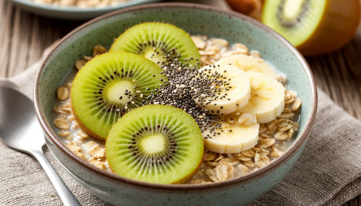 · Ингредиенты: Овсяные хлопья – 50 г; Натуральный йогурт – 150 г; Киви – 1 шт.; Семена чиа – 10 г. · Приготовление: С вечера смешайте в банке хлопья, йогурт и семена чиа. Утром добавьте нарезанный свежий киви. · Ингредиенты: Яйцо куриное – 1 шт. · Ингредиенты: Куриное филе – 150 г; Овощи (болгарский перец, цуккини, помидоры черри) – 250 г; Оливковое масло – 5 г. · Приготовление: Нарежьте курицу и овощи крупными кусками, сбрызните маслом, добавьте травы. Запекайте в аэрогриле 20 минут при 180°C. · Ингредиенты: Кефир 1% – 250 мл. · Ингредиенты: Креветки (замороженные) – 150 г; Авокадо – 60 г; Огурец – 150 г; Листья салата Айсберг – 100 г; Лимонный сок. · Приготовление: Креветки разморозьте. Нарежьте авокадо, огурец и смешайте с креветками и хрустящими листьями салата. Заправьте лимонным соком.