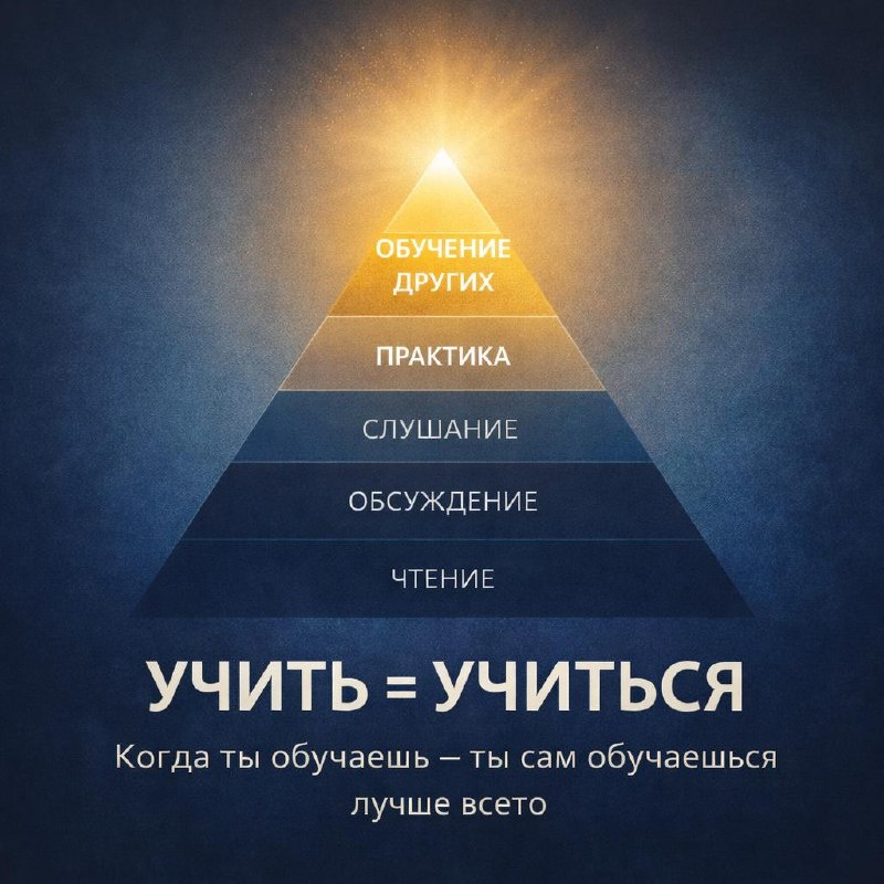 Программа: Методист дополнительного профессионального образования. Если успешно завершу обучение и сдам экзамены — получу официальный статус и смогу получить лицензию на образовательную деятельность. Это не полноценный диплом. По новым законам я не смогу преподавать в средней школе. Но у меня и нет таких планов. И всё равно — есть чувство неполноценности. Как будто "не настоящий". Как будто "диплом неполный". Но я знаю зачем я это делаю. Последние годы я много разрабатываю программ. Много работаю с людьми именно как учитель, тренер, наставник. С собственниками бизнесов. С их командами. Разрабатываю большие бизнес-образовательные программы. И я стал признавать: один из моих даров — быть учителем. Не просто консультантом. Не просто советником. А тем, кто учит. Кто ведёт. Кто передаёт. Мне очень откликается пирамида обучения. Суть проста: когда ты обучаешь — ты сам обучаешься лучше всего. Потому что чтобы объяснить — ты должен значительно глубже разобраться в теме. Не поверхностно "зн