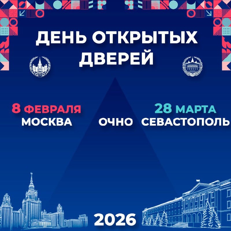 8 февраля 2026 года Московский государственный университет имени М.В. Ломоносова откроет свои двери для абитуриентов в Москве, а 28 марта 2026 года в Филиале в городе Севастополе! С программой мероприятий в г.Москва можно ознакомиться ниже и на официальном портале: https://openday.msu.ru/ 🩷 09.00-14.30 Презентация Филиала МГУ в г. Севастополе (Фойе 2 этажа Главного здания МГУ имени М.В. Ломоносова); 🩷10:00 Выставка факультетов, филиалов и школ; 🩷12:00 Лекция ректора Московского университета, академика РАН Виктора Антоновича Садовничего (ссылка на онлайн - подключение будет доступна 8 февраля); 🩷14:30 Дни открытых дверей на факультетах. 🌟 День открытых дверей в Филиале МГУ в городе Севастополе в очном формате пройдет 28 марта 2026 года. С программой мероприятий в г.Севастополе можно ознакомиться по активной ссылке: https://vk.cc/cU23R0 Следите за новостями в наших в социальных сетях: ✅ На сайте нашего филиала: https://msu.ru/ ✅ На странице в VK: https://vk.com/msusev ✅ Кана