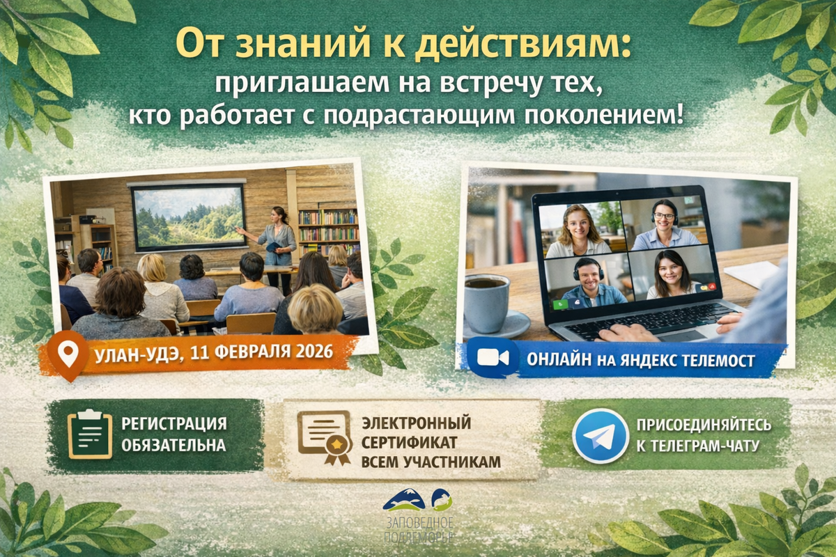 ФГБУ «Заповедное Подлеморье» приглашает принять участие в семинаре-практикуме «Экологическое воспитание подрастающего поколения в образовательных учреждениях». Он состоится 11 февраля 2026 года, в 10:00. Два формата участия: 📍 ОЧНО – в Центральной библиотеке им. Калашникова (г. Улан-Удэ, ул. Ленина, 17); 💻 ОНЛАЙН-подключение через платформу Яндекс Телемост. Ссылка для подключения будет направлена зарегистрированным участникам за 30 минут до начала семинара. 👥 К участию приглашаются: – педагоги и учителя; – воспитатели; – руководители экологических объединений (кружков); – руководители школьных лесничеств. Важно: • количество мест для очного участия ограничено – просим регистрироваться только при уверенности в личном присутствии; • для онлайн-участников обязательно: включённая камера и аккаунт с именем в формате «Фамилия Имя». 📄 По итогам семинара участники получат электронный сертификат (при условии участия во всех занятиях) 📝 Регистрация обязательна для всех форматов участия: htt
