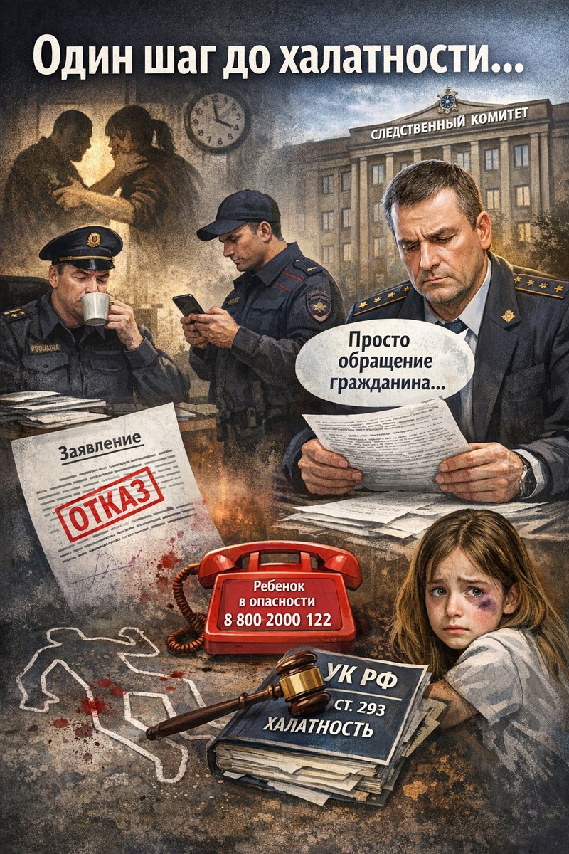 🧷 Один шаг до халатности Наверное, каждый слышал истории о бездействии сотрудников полиции: когда, получив сообщение о домашнем насилии, они либо не торопились на вызов, либо не спешили его регистрировать. Тем временем жертва погибала. А следом возбуждали дело о халатности по ст. 293 УК РФ в отношении полицейских. ⚖️ Но следственный комитет, как известно, не такой. 📞 У них даже есть специальный номер телефона «Ребенок в опасности». 🔎 И вообще, Александр Иванович может взять на контроль, и всем капец. 🗂️ В СК Ленинского района сообщение нашей коллеги о домашнем насилии зарегистрировали как «обращение гражданина». Представляете? 📝 Следователь СК читает пятистраничный документ об истязаниях, в том числе в отношении несовершеннолетней девочки, о ножевом ранении и прочих обстоятельствах... и такой: 💬 «Ну это же не преступление... Это просто гражданин обратился... О чем? Да это же предложение о профилактике преступлений! Автор обращения делится своей историей, как делать не надо.