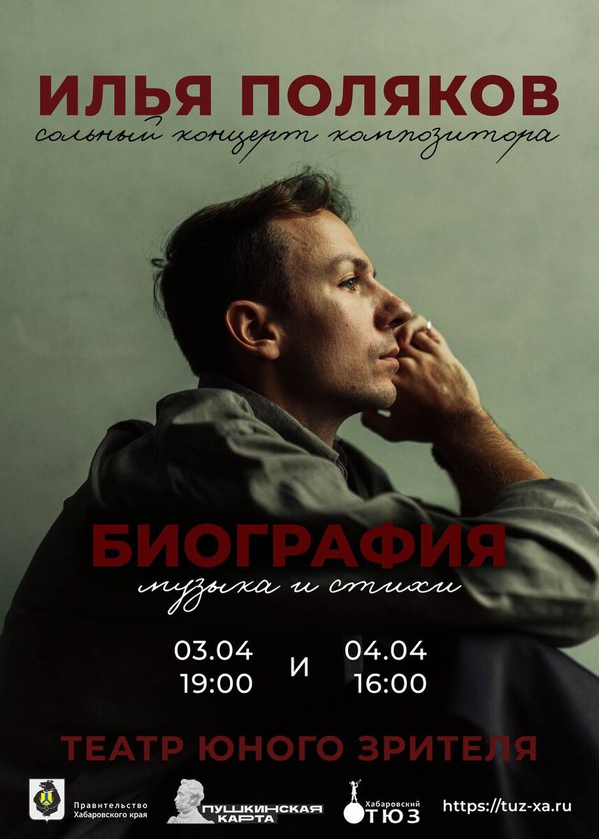 Биография ✔ Сольный концерт пианиста и композитора Ильи Полякова ✔ Авторская программа, охватывающая все этапы его творчества ✔ Фортепианные произведения из разных альбомов и новые сочинения ✔ Музыка, стихи и работа с тишиной как единое повествование ✔ Камерная атмосфера и эмоциональное музыкальное путешествие 📅 Когда: #3_апреля 19:00, #4_апреля 16:00 ⛳ Где: Хабаровский краевой театр юного зрителя 💳 Стоимость: 800-1200 руб Билеты 👉 Афиша Хабаровска. Куда сходить, экскурсии
