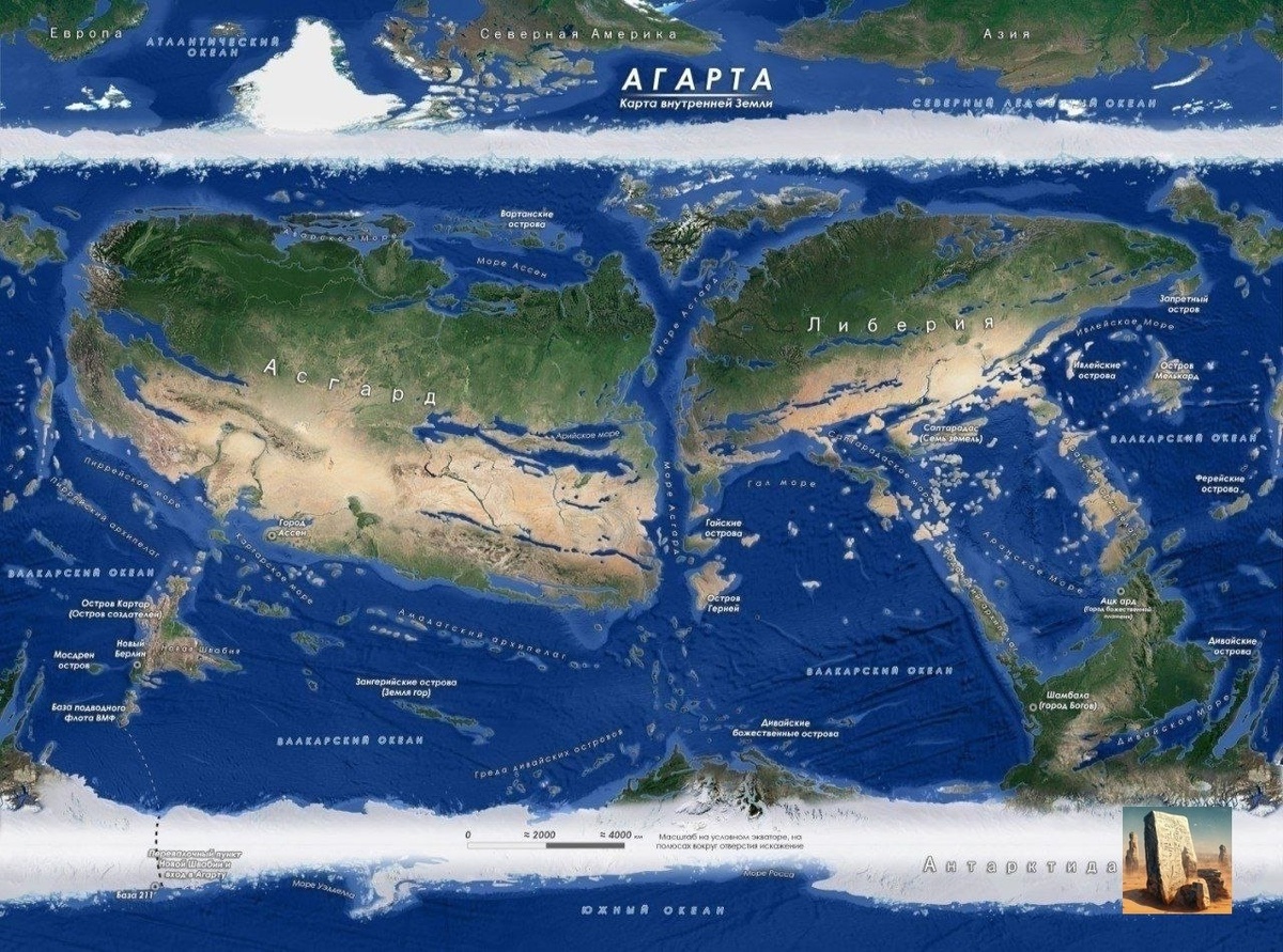 На них суша разделена на два больших континента: «Асгард» и «Либерия». Однако третий континент, расположенный в южном полушарии и считающийся местом нахождения легендарного города богов Шамбала, на этих картах не показан. По всей ширине Агарты тянется Валкарский океан, покрытый сотнями маленьких островов. Среди них выделяется огромный остров Создателей – Картар. Предположительно, с 1939 года там обосновались немцы и создали территорию под названием «Новая Швабия», похожую на регион в Антарктиде, который служил перевалочным пунктом и входом в Новую Швабию и Агарту. Добраться туда можно, погрузившись на нулевой долготе под лед Антарктиды и проплыв около 1700 километров. Терра инкогнита | Неизвестная земля