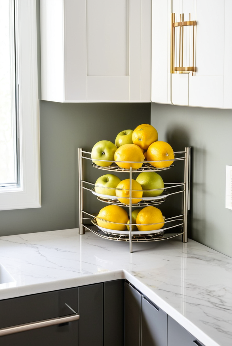 Оптимизация рабочего пространства — ключ к комфорту. Угловая полка улучшает эргономику кухни, располагая все нужное под рукой; Это идеальное решение для компактного хранения. Размещенная у раковины, она работает как полка над раковиной для сушки мелочей или губок. Один из ярусов — прекрасная вентилируемая подставка для овощей и фруктов. Это не только освобождает столешницу, но и обеспечивает циркуляцию воздуха, сохраняя продукты свежими намного дольше. Все необходимые ингредиенты и предметы теперь находятся в зоне вашей видимости и легкого доступа, что значительно ускоряет процесс ежедневной готовки.