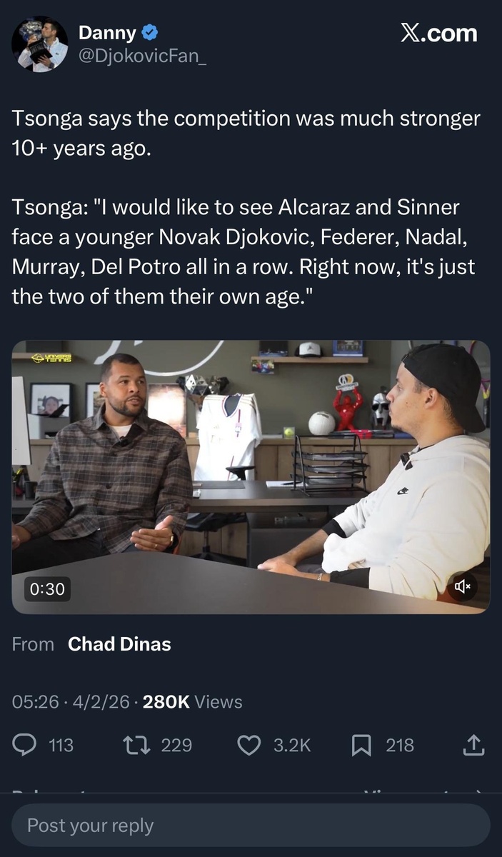 🤨 После высказываний Тони, Тсонга тоже решил подколоть Алькараса. Тсонга считает, что конкуренция 10+ лет назад была намного жёстче: 💬 «Я хотел бы увидеть, как Алькарас и Синнер столкнутся с молодыми Новаком Джоковичем, Федерером, Надалем, Марреем, Дель Потро один за другим. Сейчас есть только они вдвоём одного возраста». А разве предыдущее поколение не говорило, что если бы конкуренция была хорошей, то старая гвардия – Федаль и Ноле – не должна была бы так легко доходить до финалов? 🤔 Подпишись на Эйс и точка