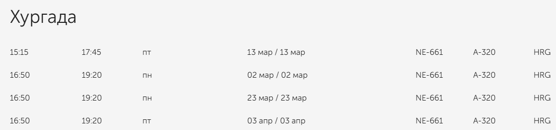 С 2 марта открывается программа полётов из Саратова в Хургаду. Раз в 10-11 дней до конца летнего расписания. Это уже третья попытка открыть рейсы в Египет из Саратова (египетская авиакомпания Nesma airlines на Аirbus-320). Предыдущие оканчивались отменой рейсов до их начала. Посмотрим как получится в этот раз.