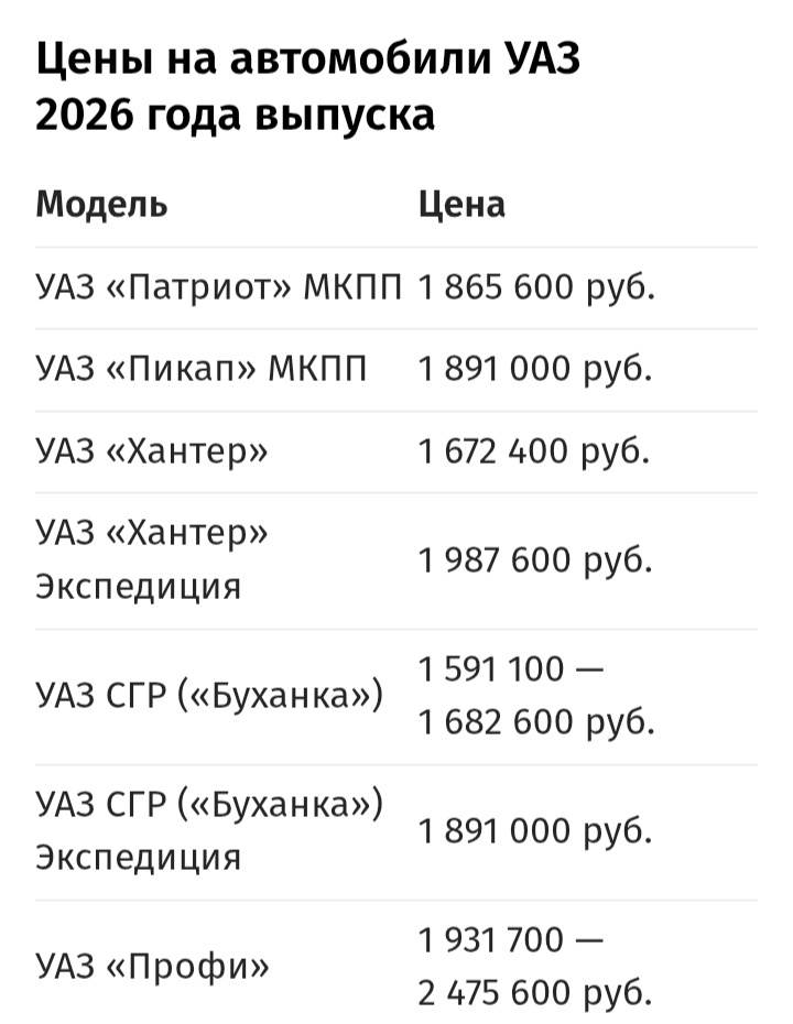 На сайте Ульяновского автозавода представлены прайс-листы на модели УАЗ 2026 года. Их стоимость осталась неизменной по сравнению с версиями 2025 года, которые с 1 января увеличили ценник на 23 400–40 600 рублей, выяснило издание «Автоновости дня» после анализа актуальных тарифов предприятия.