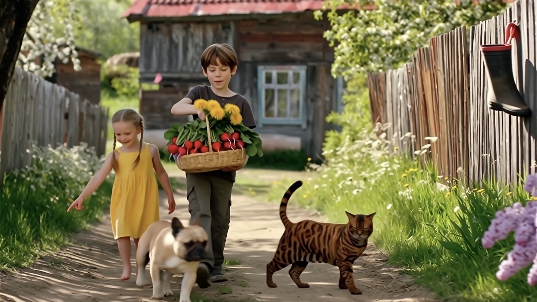 Артём, распираемый важностью миссии, упаковал редиску в корзинку. Алёна тут же украсила её сверху одуванчиками. «Чтобы красиво!» — заявила она. Буся фыркнула в знак одобрения, а Барсик снисходительно наблюдал за суетой с крыльца.