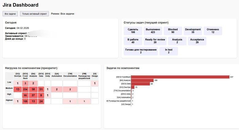 Итак, после того, как был реализован функционал генерации HTML страницы с интерактивным графом связей задач Jira, я взялась за создание Дашборда. Цель дашборда была обозначена как предоставление лидам краткой сводной информации о нагрузке в команде и о "бесхозных" задачах в Jira - то есть задачах, у которых отсутствует назначенный Исполнитель, а также задачах без указания Компонента (то есть, по сути, рабочей группы, к которой эта задача относится). В итоге, я решила реализовать следующую структуру дашборда: 1. Текущая дата, текущий активный спринт и количество дней до его завершения. 2. Набор карточек с количеством задач по статусам. 3. Тепловая карта с количеством задач по Компонентам в зависимости от приоритета. 4. Диаграмма с количеством задач по компонентам. 5. Тепловая карта нагрузки по членам команды - в зависимости от приоритета задач. 6. Таблица с задачами без Компонента. 7. Таблица с задачами без Исполнителя.