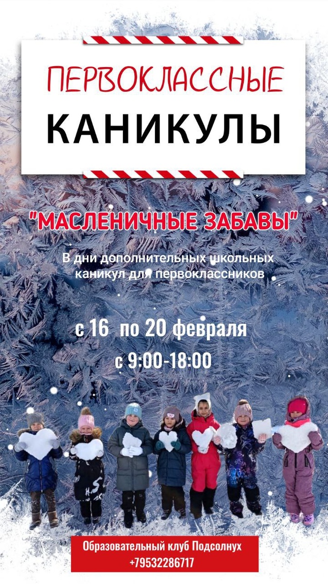 🎒 Дополнительные каникулы объявили, а работу никто не отменял?🧐 Не знаете, с кем оставить ребёнка, чтобы ему было интересно, безопасно и весело? Мы знаем решение! 🔅Приглашаем первоклассников на масленичные каникулы— яркую, тёплую и по-настоящему праздничную смену, где каждый день наполнен играми и творчеством! С 9.00 до 18.00 Что нас ждёт: 🔸Кулинарный МК- блины, оладьи, вареники 🔸Масленичные забавы- игры, викторины, конкурсы 🔸Изготовим куклу-оберег Масленица 🔸Весёлая математика и чистописание 🔸Настольные игры, прогулки на свежем воздухе 🔸Чтение 🍽Комплексный обед, второй завтрак и полдник ❗️Вы можете выбрать всю неделю или несколько дней. 💯Ребёнок не будет скучать и «сидеть в телефоне». Образовательный клуб Подсолнух 📞+79532286717
