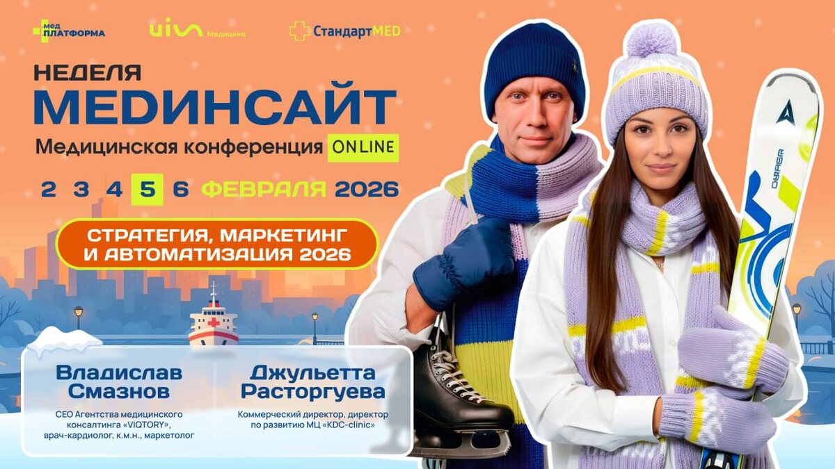 Не пропустите! Мой доклад 5 февраля, четверг. ⏰ 11:00–11:30 Расскажу про маркетинговую стратегию, как драйвер роста бизнеса. Или как 5 клиентских политик увеличил доход клиники на 40% на высококонкурентном рынке — Маркетинг не равен промо — Позиционирование — фундамент системного маркетинга — Клиентские политики как основа маркетинга: — Продуктовая политика — Ценовая политика — Сбытовая политика — Коммуникационная политика 📍Участие бесплатное, регистрация обязательна: https://clck.ru/3R3N2t 🔹2-6 февраля 🔹Более 50 выступлений собственников и руководителей 🔹примерно 2.200–2.500 слайдов практики, идей и рабочих инструментов. Подробная программа и регистрация на Неделю MEDинсайта 2026!