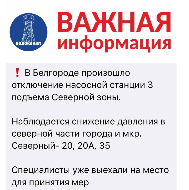 ❗️В Белгороде отключилась насосная станция 3-го подъема Северной зоны