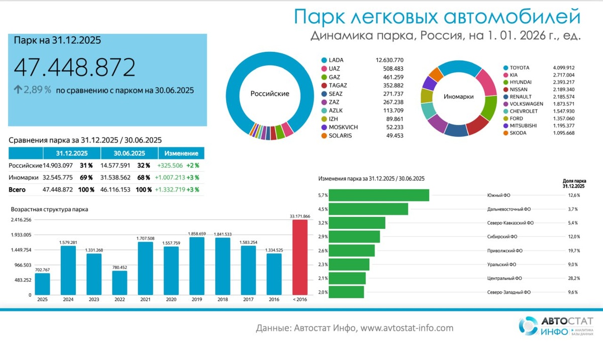 По данным «Автостат Инфо», на 1 января 2026 года зарегистрированный парк легковых автомобилей в России достиг 47,45 млн единиц. Всего за полгода он прибавил около 1,33 млн машин (+3%). Заметно, что рост идет за счет иномарок: их стало больше на 1,0 млн (+3 %), тогда как российский парк прибавил 325 тыс. машин (+2 %). На долю отечественных брендов приходится 31% парка против 69% у иностранных. Если смотреть на структуру по странам происхождения, российский сегмент насчитывает 14,6 млн машин, японский — 10,8 млн ед., корейский — 5,9 млн ед., немецкий — 5,0 млн ед., американский — 3,1 млн авто. Китайский парк уже достиг 3,0 млн автомобилей, то есть примерно 6% от всего объема. Остальное приходится на Францию, Чехию и прочие страны. Фактически костяк парка сегодня формируют Россия, Япония и Корея, а Китай быстро превращается в четвертый полноценный полюс. Но топ-10 китайских брендов приходится свыше 2,1 млн машин в автопарке. Лидируют Haval (613 тыс. шт.) и Geely (530 тыс. ед.), за ними