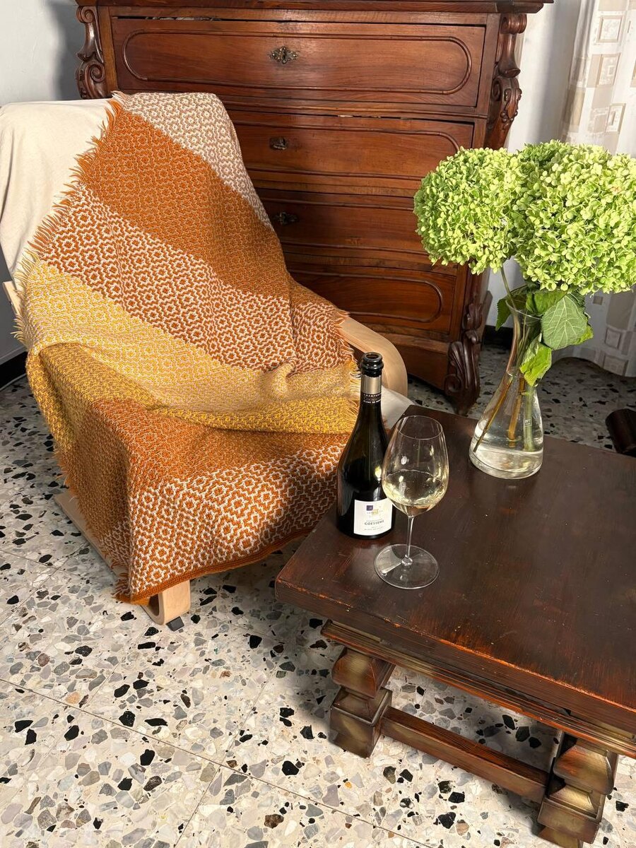 Дарья связала этот моноплед еще в прошлом году, а я периодически к нему возвращаюсь, чтобы настроение забрать) Столько тут цвета и солнца. Моноплед – потому что связан одним узором + ручной градиент. Базовые мозаичные узоры для таких проектов вы найдете на моем сайте в разделе «Блог».