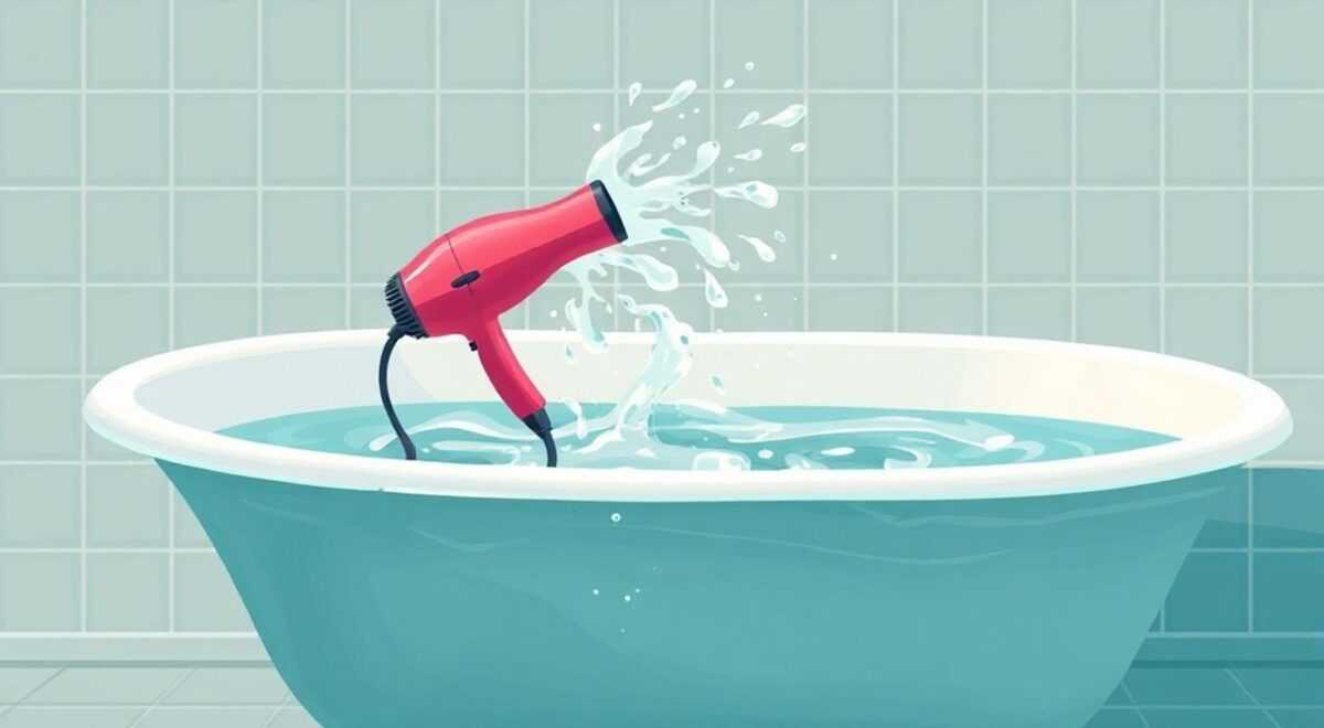 Падение фена в ванну с водой представляет серьёзную опасность. Электроприборы, подключённые к розетке, при попадании в воду могут вызвать короткое замыкание и поражение электрическим током. Когда фен падает в воду, она заливает его не сразу полностью. Это приводит к замыканию нуля и фазы. В некоторых случаях сначала может залиться только фазный провод. В результате между феном и ванной возникает электрический ток, который проходит через струю воды из крана или душа. Если человек в этот момент находится в ванной, ток может пройти через его тело. Это возможно, если сопротивление кожи и тканей тела окажется ниже сопротивления воды на каком-либо участке цепи. Поражение током может привести к остановке сердца. В некоторых случаях сердце удаётся запустить снова, но это не всегда возможно. Важно помнить, что опасность зависит от состава воды. Растворённые в водопроводной воде соли (например, карбонаты магния и кальция) увеличивают её проводимость, что повышает риски для жизни. Также имеет зна