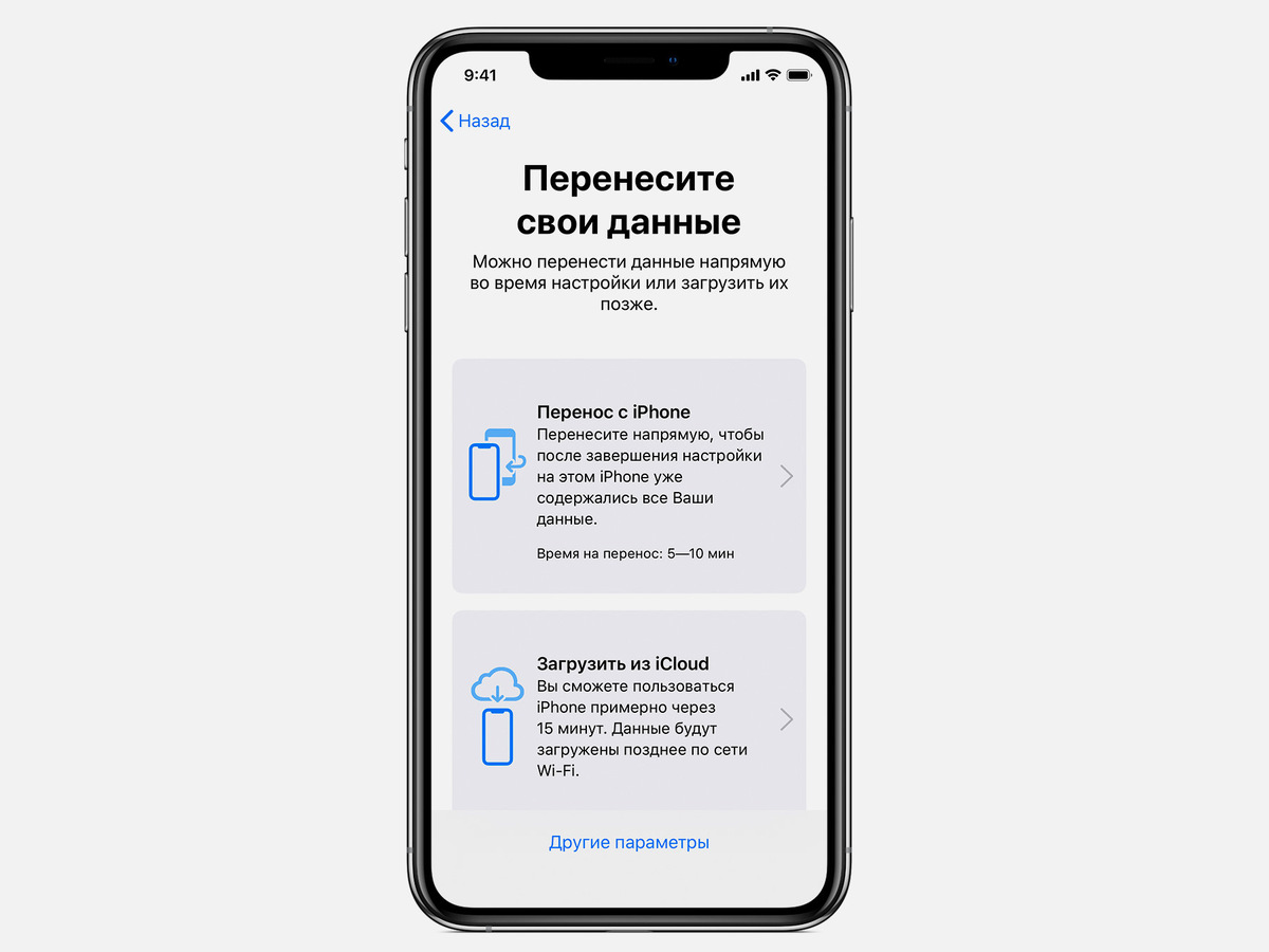 С помощью функции «Быстрое начало» можно просто перенести данные на новый iPhone, если предыдущий находится под рукой. Так как этот инструмент одновременно задействует оба гаджета, для указанных манипуляций нужно подобрать то время, когда они не понадобятся в течение нескольких минут. Шаг 1. Включите новый iPhone и положите его рядом с текущим. Шаг 2. Дождитесь, когда на экране текущего iPhone появится предложение настроить новый с помощью Apple ID, и нажмите на кнопку «Далее». Шаг 3. Когда на экране нового iPhone появится тематическая анимация, наведите на нее видоискатель текущего и продолжите операцию. Шаг 4. Введите код-пароль от текущего iPhone, когда соответствующий запрос появится на экране нового. Шаг 5. Проведите настройку Face ID или Touch ID. Шаг 6. Введите данные учетной записи Apple ID на экране нового устройства, когда оно предложит это сделать. Шаг 7. На новом iPhone появится запрос на перенос данных из iCloud или создания новой резервной копии текущего устройст