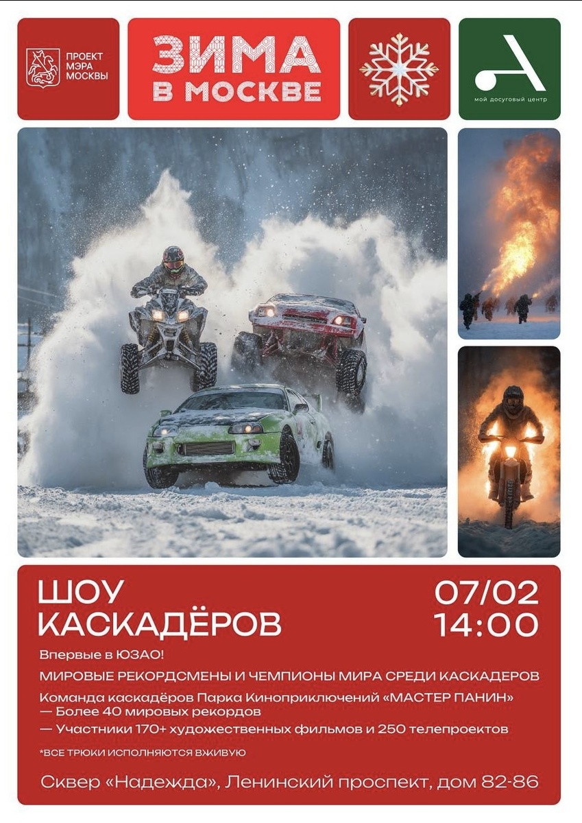 7 февраля в 14:00 в парке «Надежда», расположенном на Ленинском проспекте (владение 82–86), состоится захватывающее «Шоу каскадеров» от команды Парка Киноприключений Мастера Панина. Зрителей ждут выступления лучших профессионалов, включая виртуоза паркура Павла «Пабло» Иванова — победителя проектов «Супер Ниндзя» и «Кардо». Руководит проектом Игорь «Мастер» Панин, легенда российской каскадерской индустрии, президент Международной Академии Трюка. В программе — уникальные трюки, исполняемые вживую без компьютерной графики и монтажа. Среди них: сальто через движущийся автомобиль, двойной дрифт без водителей, когда пилоты покидают машины на полном ходу, и эффектный номер «Русский Призрачный Гонщик» с мотоциклистом на пылающем байке. Кульминацией станет сальто с горящей вышки через автомобиль, требующее невероятной точности и бесстрашия. #паркур #выступления #кардо #москва #сочи Подробнее...