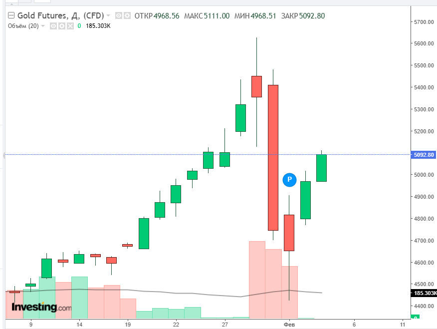 На второй день после дна-дна золото преспокойно добивает обратно до 5.100. Обычные для природы волновые колебания - чем сильнее пихнешь "туда" - тем сильнее прилетает "обратно". А затем - снова "туда", только послабее. Как по мне, то глядя в магический кристалл мне видится в ближайшем будущем треугольник с затухающими колебаниями и дальнейшим переходом в успокоительный боковик. Ненадолго. Надо дождаться второго пика (сегодня-завтра?) и тогда можно будет предположить примерный уровень будущего успокоительного боковика. Но уже сейчас, посмотрев на начала предыдущих коррекций и вглядевшись в магический кристалл - можно разглядеть (смутно, конечно) уровень 4.900. Затухающие колебания после сильного удара - всеприродное и абсолютно естественное явления. Биржа - не исключение. На картинке сверху - необычно низкие и снижающиеся объемы на росте вверх с 20 по 28 января, последние 3 дня - вообще исключительно низкие. Похоже, последний припадок роста происходил чисто на американских физлицах (гр